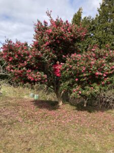 庭では、昨年11月のボランティアの際に集めてあったものを2月の終わりごろに焼き、今はすっかりきれいになっています。冬のあいだ見事に咲いていた山茶花(サザンカ)もとても美しく、濃いピンクの花が空間を明るく彩ってくれました。
